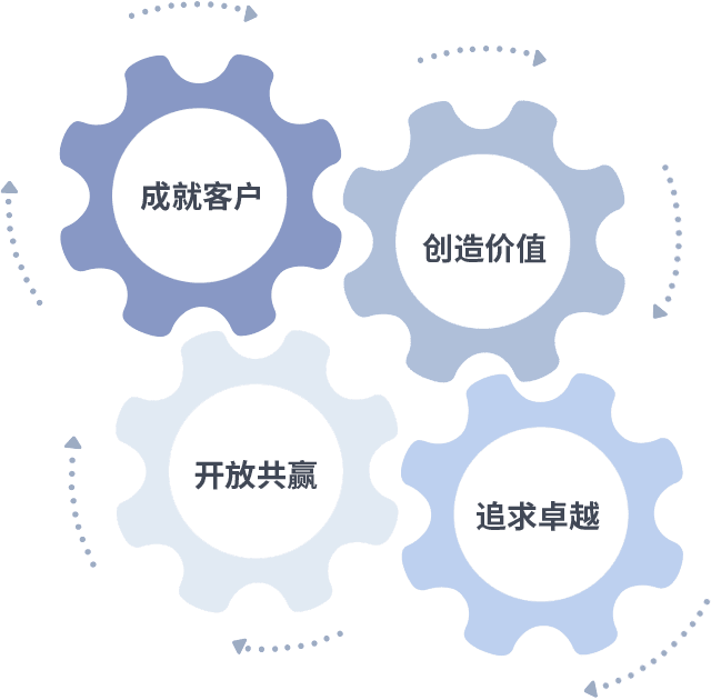 成就客户是一切决策的出发点,,创造价值是衡量所有工作的标准,,追求卓越是我们做事做人的态度,,,开放共赢是我们的格局也是最终的结果。。价值观的齿轮环环相扣,,,推动着组织里的每个人不断向前。。。。