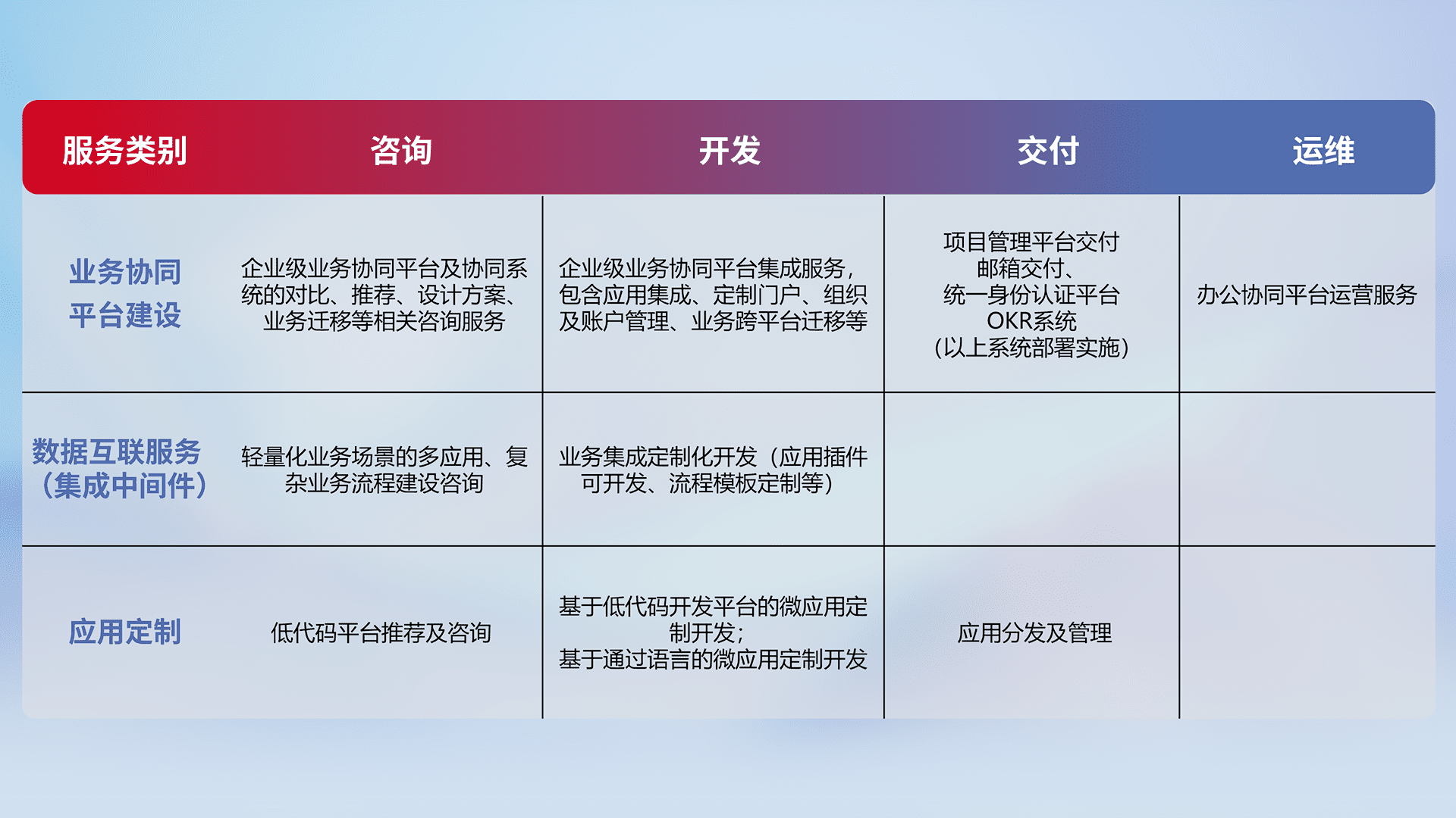针对钉钉、、、、企微、、IDaas等平台级产品提供产品的规划、、、方案、、、、交付、、、、定制化开发等服务,,实现如统一协同办公、、、智能客户服务、、、、混合会议管理、、、智能数据查询、、、、等业务场景,,实现数字化转型。。。