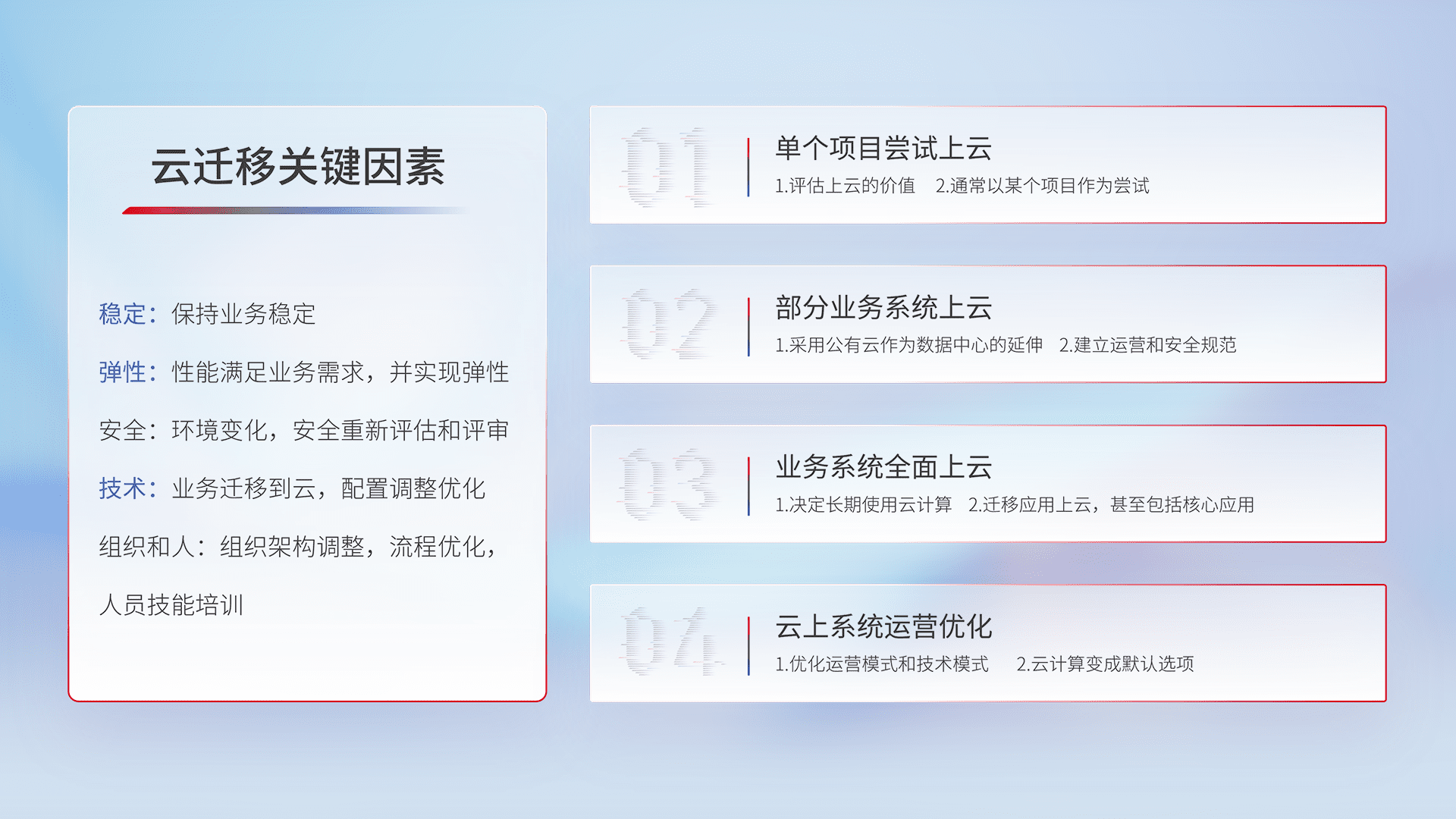 结合实际业务,,,从规划设计、、、云平台选型、、、云原生改造、、、、数据迁移、、、集成交付,,,迁移全过程为客户识别最佳上云路径,,做好风险识别管理,,,设计网络架构、、身份权限、、、、安全审计合规、、操作审计、、日志审计、、、、监控告警策略、、多站点容灾设计等,,对云上基础设施进行整体规划,,提升IT治理水平,,,以满足弹性、、、、高可用、、、高性能的需求。。。