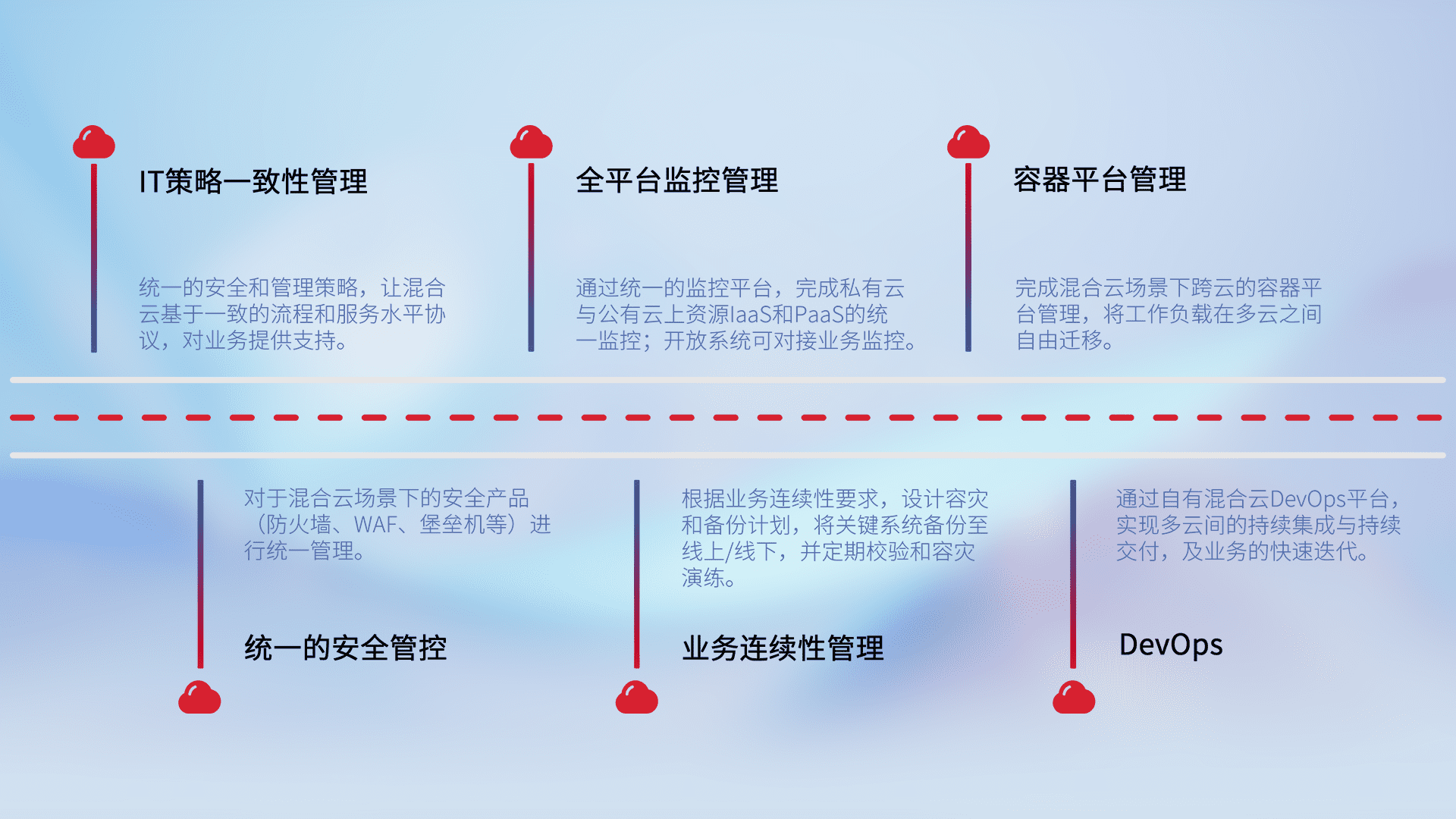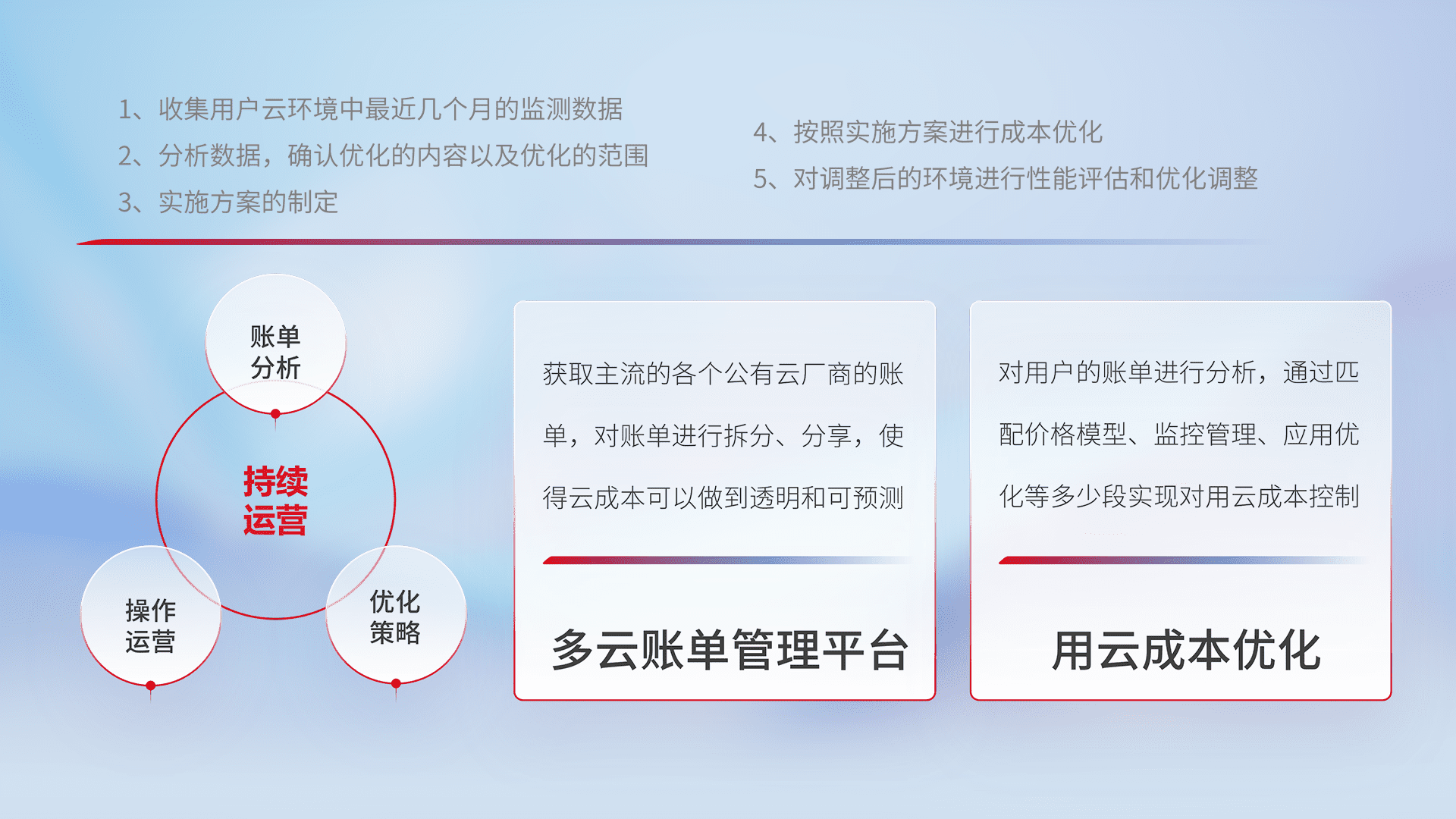 通过多云纳管,,,以统一的资源数据模型把客户的云资源进行抽象和封装,,,进而实现对多云资源的统一操作,,,保障云资源管理的可靠性、、、、稳定性与可用性。。。。量身定制化运维内容,,配置、、、开发运维、、补丁管理、、、备份、、、监控、、、认证和访问管理、、、审计和日常巡检等,,保障在用云过程中的可靠度,,稳定度以及高可用率。。。