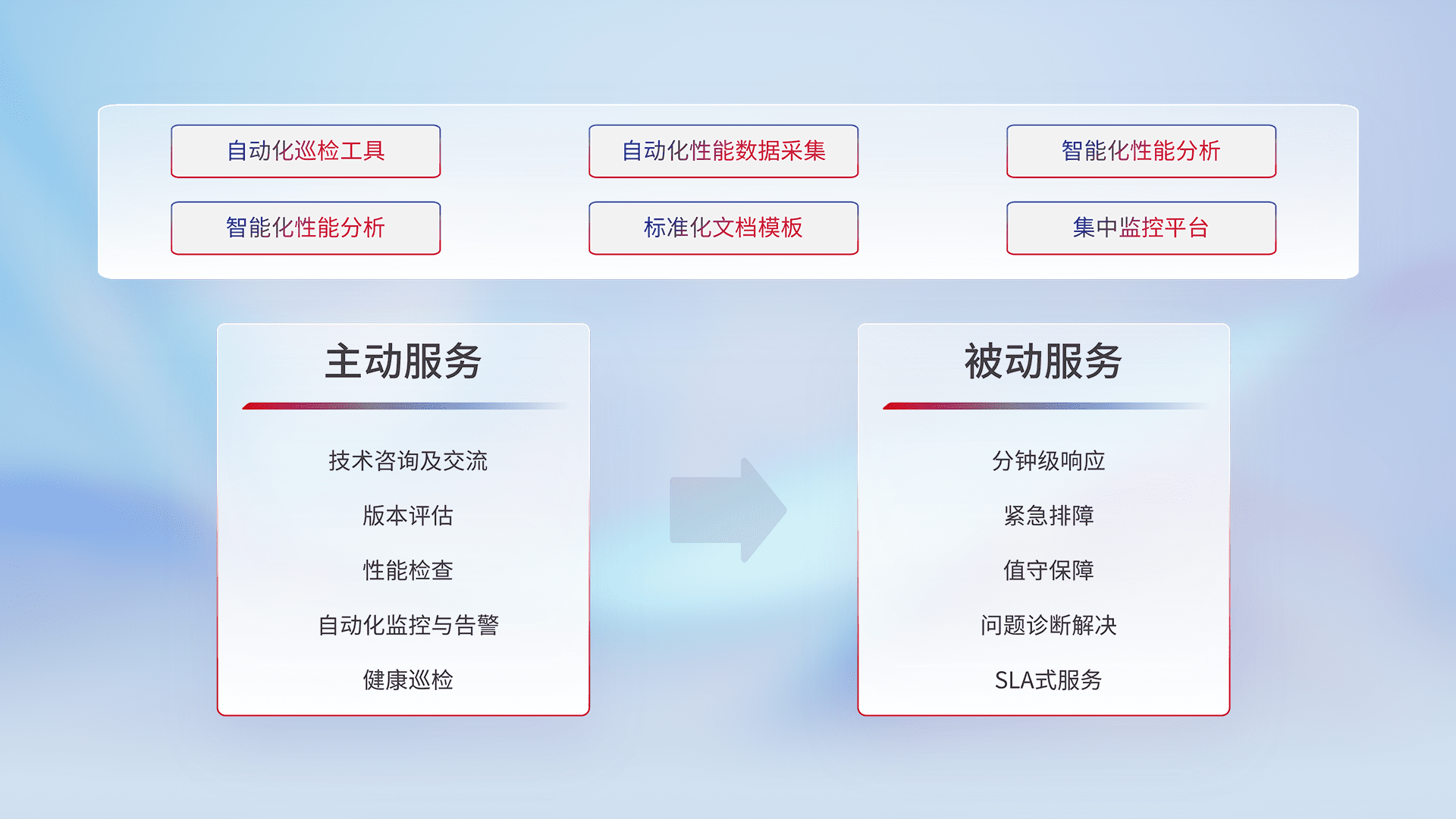 智能化工具和标准化文档,,保障服务质量,,,,提供主动服务(包含技术咨询、、、版本评估、、、、性能检查、、、、自动化监控与告警、、健康巡检)和被动服务包含(分钟级响应、、紧急排障、、、、值守保障、、问题诊断解决、、SLA服务)。。。。