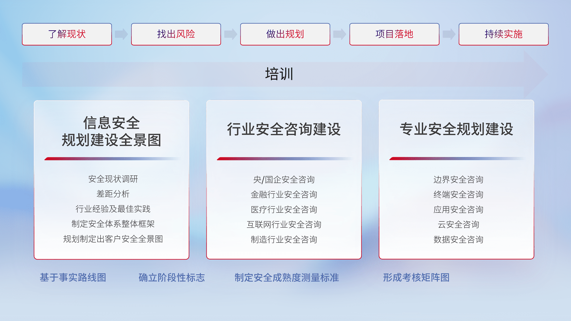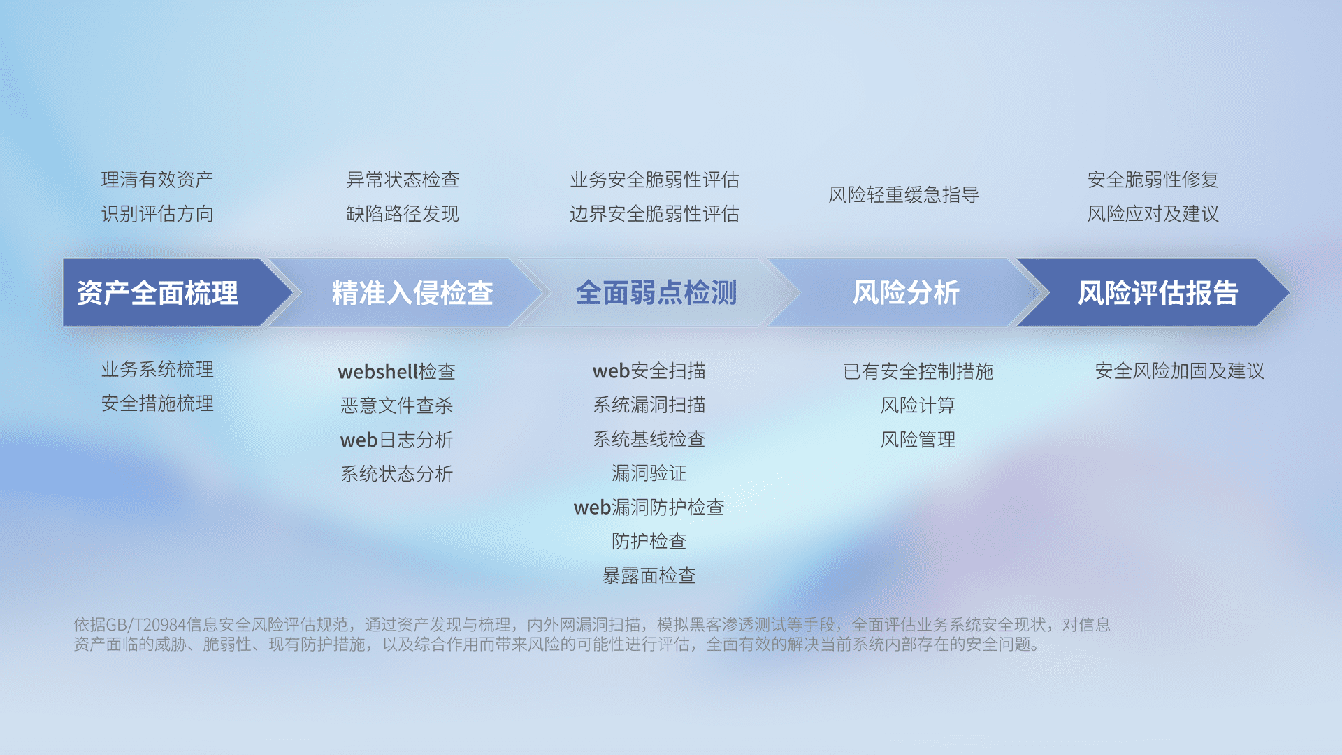 针对客户行业特性,,,,以专业的安全服务+多厂商联合解决方案提供专属的一站式安全管理服务,,,帮助客户全面感知网络空间威胁,,,基于识别、、检测、、分析、、防护、、、监测、、、响应的服务理论模型,,,从方案咨询、、、集成交付、、、评估验证、、、、优化加固、、运维运营,,,致力于为客户提供完整的闭环管理式安全服务。。。以实战经验为客户打造高抵御风险的安全体系,,,帮助客户发现威胁、、对抗威胁、、处置威胁,,,不断积累安全对抗能力,,持续保障数字化安全。。